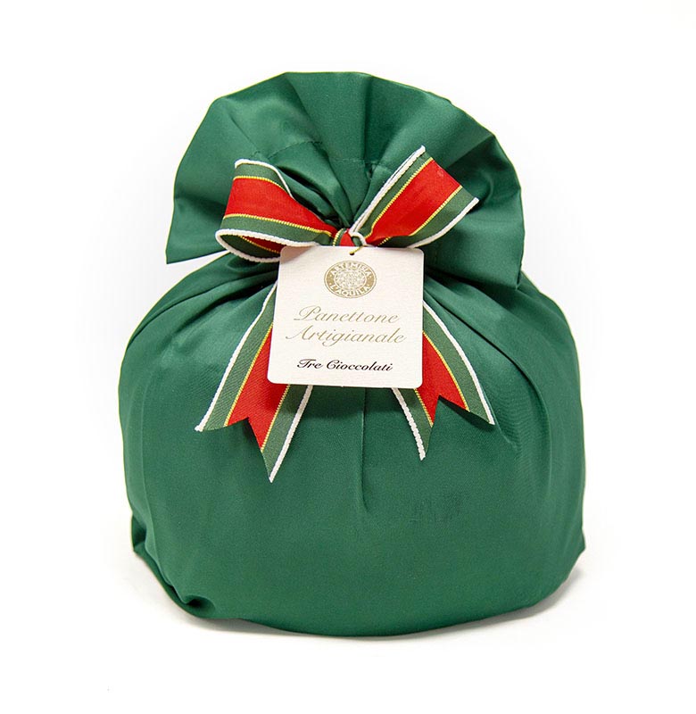 • Panettone Tre Cioccolati:  Terza ed ultima novità del 2021, è l’evoluzione del classico panettone con gocce di cioccolato fondente, ora si arricchisce di cioccolato bianco ed al latte, un tris di piccole gocce per un ottimo equilibrio di sapori, che vengono versate direttamente nell’impasto; cioccolati tutti di provenienza belga.  Confezionato a mano in elegantissimo sacchetto verde con nastro di raso.